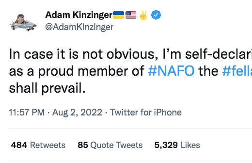 Over the past couple weeks, the NAFO “meme army” has received rhetorical support from several Baltic state leaders, and even the Ukrainian ministry of defense. Its chief advocate in the United States is Rep. Adam Kinzinger, who has interacted frequently with its founder, and has helped to solicit funds for the foreign operation. NAFO’s online troll army has also received endless applause in the D.C. neoconservative and neoliberal foreign policy think tank circuit