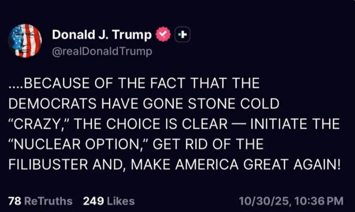 President Trump is now demanding (rightly in my view) that Senate Republicans eliminate the legislative filibuster entirely via the “nuclear option.” President Trump has publicly threatened to primary any Republican senator who refuses, posting on Truth Social that “any Republican who doesn’t vote to end the filibuster is a DEMOCRAT in disguise.” However, at least four GOP senators — Susan Collins, Lisa Murkowski, Thom Tillis, and Rand Paul — have repeatedly stated they will not vote to nuke the filibuster for appropriations bills, meaning Republicans cannot get the simple majority (51 votes) needed to change the rule. Democrats, knowing that the libertarian and “RINO” factions have capitulated, now have even less incentive to compromise. They believe they can force Obamacare expansion and further concessions simply by running out the clock indefinitely.