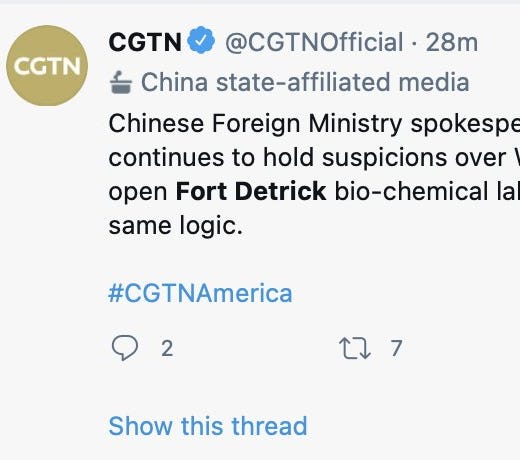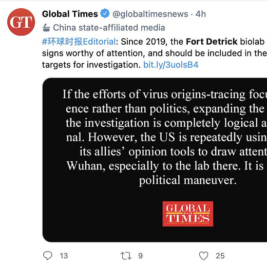 On Thursday, Chinese authorities on social media continued to demand an inquiry into Fort Detrick, continuing their attempts to redirect the focus from the Wuhan lab to Fort Detrick: