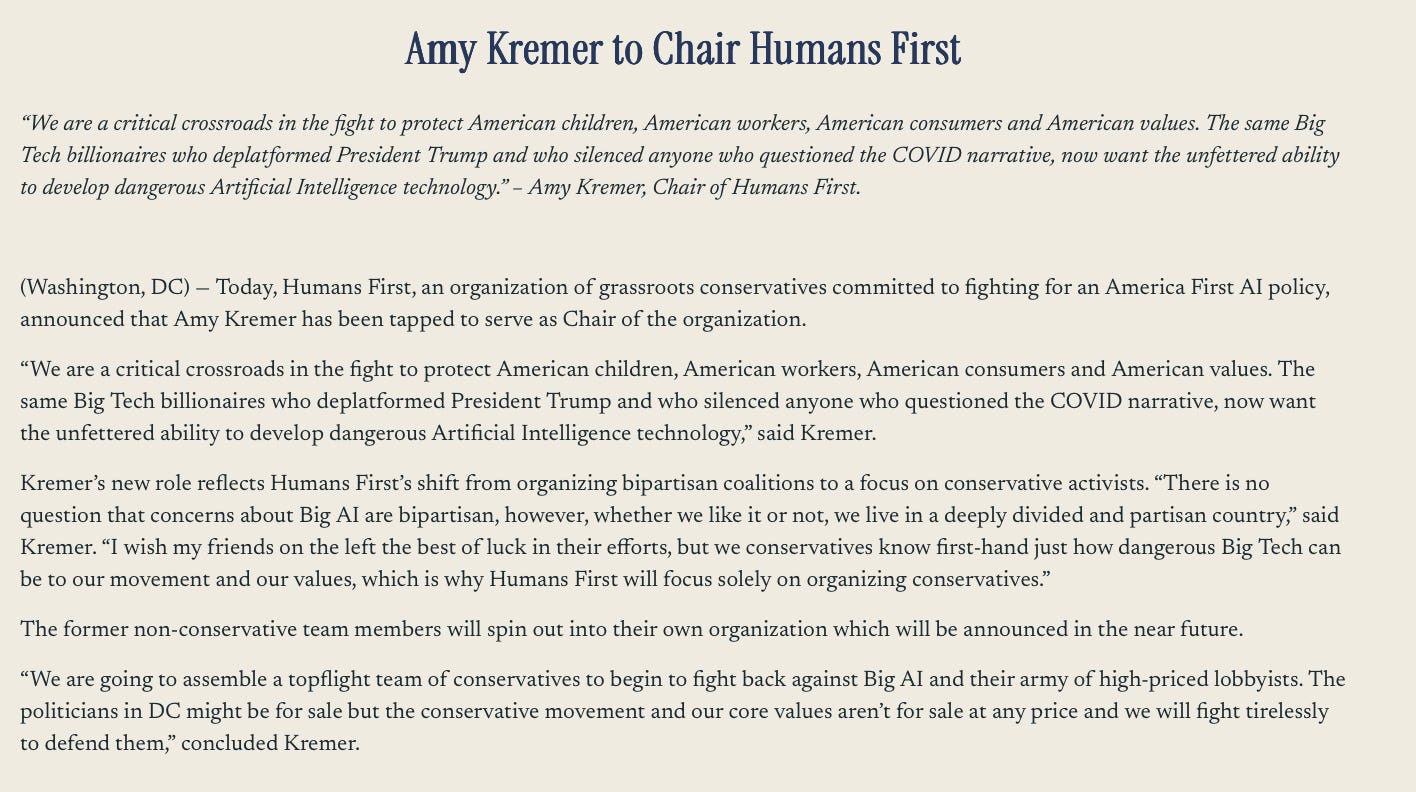 Kremer’s launch statement, delivered through the customary populist-grievance idiom, is something to behold. She warns that the “same Big Tech billionaires who deplatformed President Trump and silenced covid dissent now seek unfettered power to develop dangerous AI technology.”